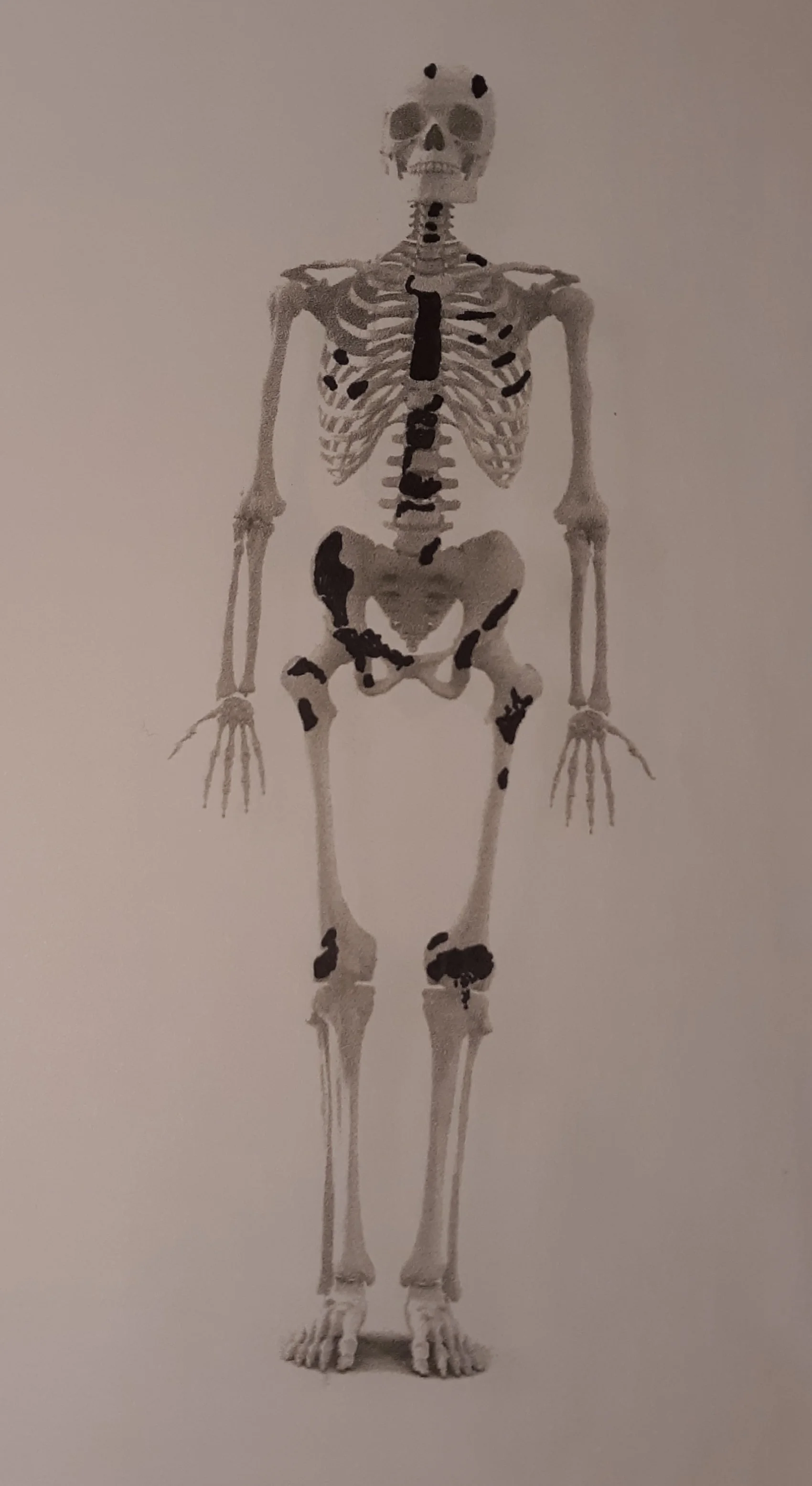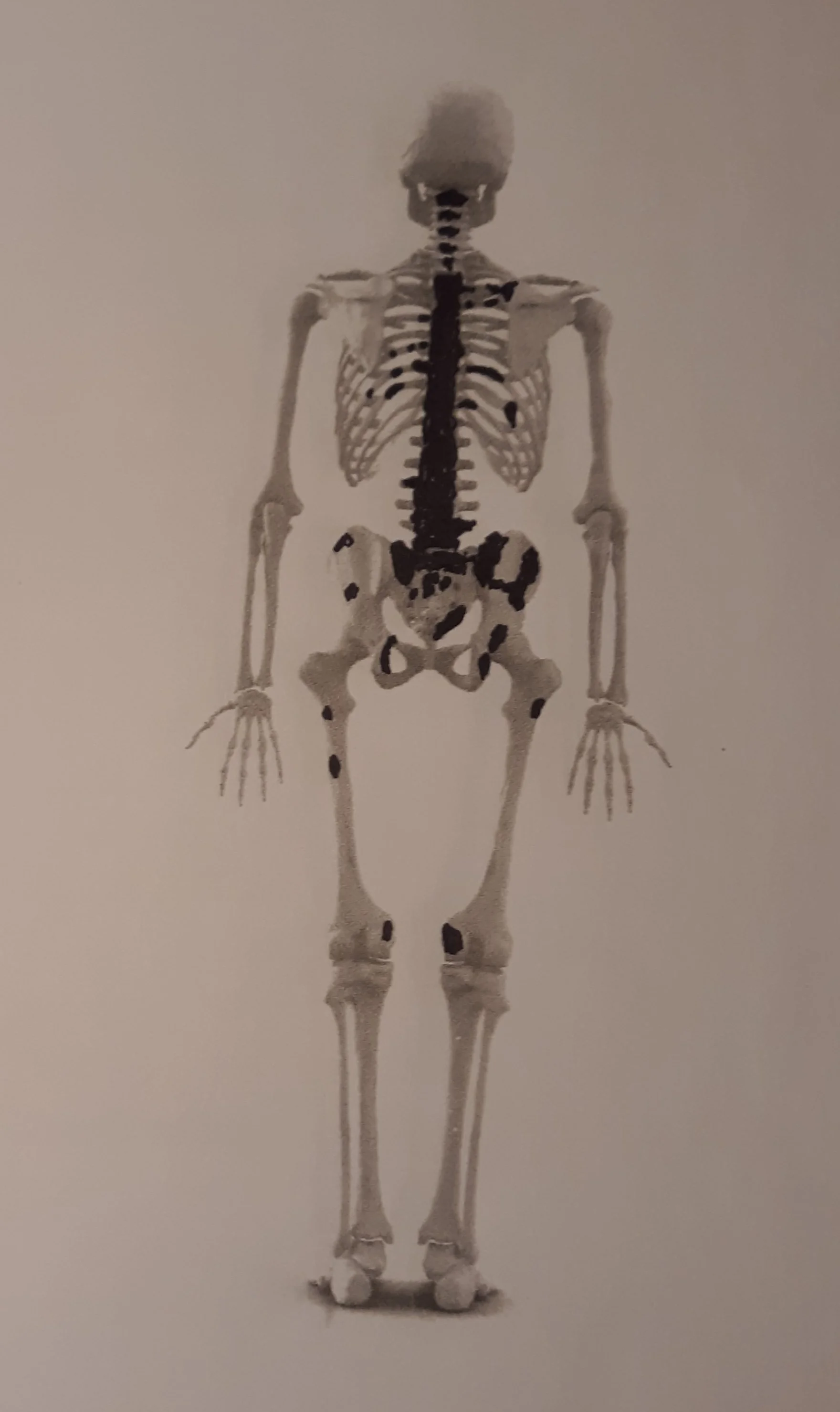 Partial whole body views and spot views of the head and neck demonstrate numerous foci of abnormal uptake consistent with metastases, involving all levels of the imaged thoracic and lumbar spine, the skull base and left frontal skull, possibly multiple cervical vertebrae, most ribs, the sacrum, both sides of the pelvis (multiple foci) and both femora and bilaterally in the knees.